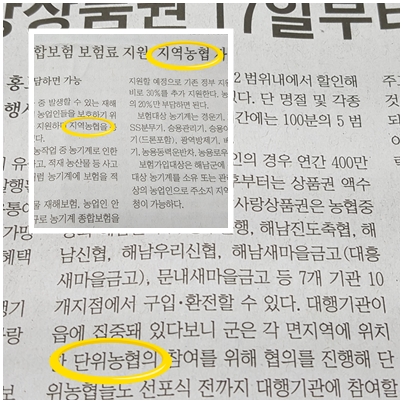 "해남관내 단위조합"이나 "해남관내 단위농협"은 잘못된 표현입니다.
