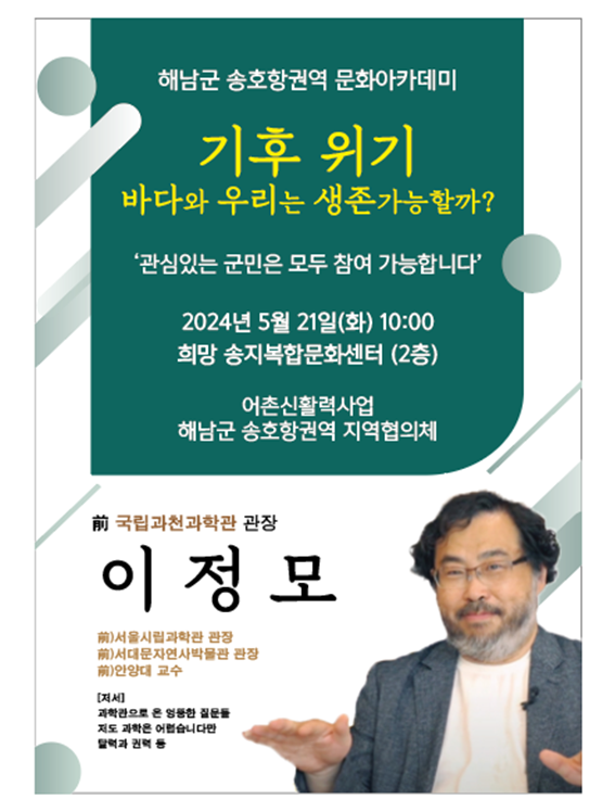 어촌신활력사업 해남군(군수 명현관) 송호항권역 지역협의체는 2024년 5월 21일 화요일 10시 해남군 송지면 희망송지복합문화센터에서 전 과천과학관장을 지낸 이정모 강사를 초빙해 기후위기에 대한 강연회를 개최한다.독일 본 대학 박사과정을 마친 이 강사는 안양대학교 교수, 서대문자연사박물관장, 서울시립과학관장, 국립과천과학관장을 역임한 바 있다. 이 강사는 과학계에서 널리 알려진 스타강사로 ‘밝히는 과학자들’, ‘차이나는 클라스’, ‘하하랜드 2’ 등 방송에 출연한 경력이 있으며 과학 팟캐스트 파토의 과학하고 앉아있네 등에 출연하여 대중들에게 과학을 쉽게 전달하는 과학 통역사 역할을 하고 있다.