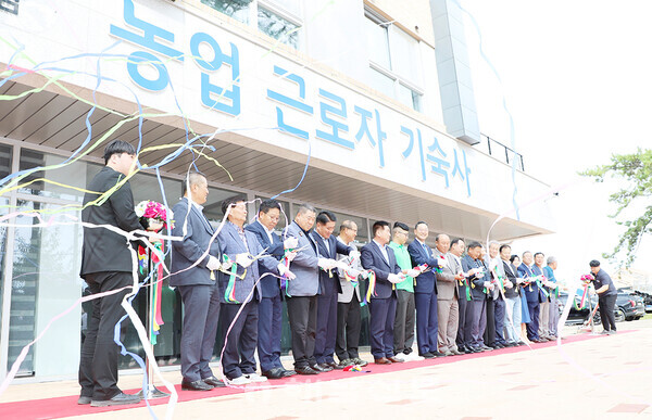 농업에 종사하는 근로자에게 쾌적한 주거환경을 제공하고 안정적인 인력수급에 도움이 될 농업 근로자 기숙사 준공식이 지난 22일 열렸다. 사진은 내외귀빈들이 테이프 커팅식을 하고 있는 모습.