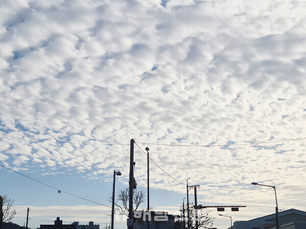 변호인 기자 구독 입력 2025.11.17 09:45 완연한 가을 날씨를 보인 지난 11일 오후 해남읍에서 바라본 하늘에 양떼구름이 펼쳐졌다. 작은 구름덩어리가 양들이 뛰어노는 모습처럼 보인다고 해 양떼구름이라는 별명이 붙었다. 저작권자 © 해남신문 무단전재 및 재배포 금지 개의 댓글 회원로그인 댓글 내용입력 댓글 정렬 최신순 추천순 답글순 BEST댓글 BEST 댓글 답글과 추천수를 합산하여 자동으로 노출됩니다. 닫기 더보기 댓글삭제 삭제한 댓글은 다시 복구할 수 없습니다. 그래도 삭제하시겠습니까? 비밀번호 닫기 댓글수정 댓글 수정은 작성 후 1분내에만 가능합니다. 본문 / 400 비밀번호 닫기 내 댓글 모음 닫기